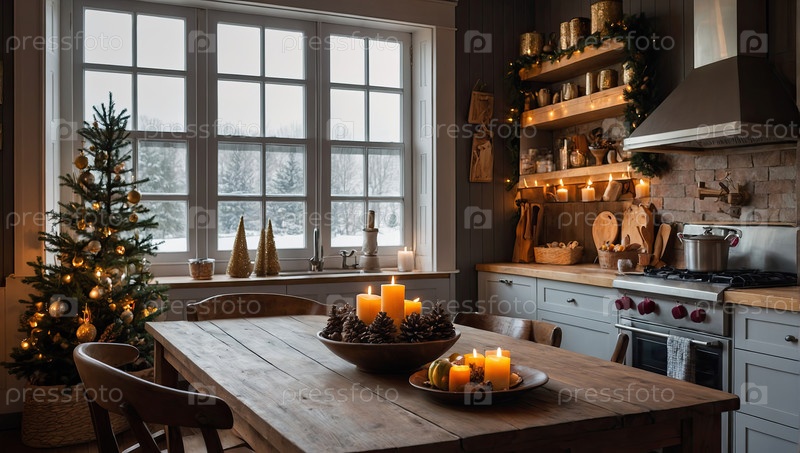 Темный интерьер уютной современной рождественской кухни, новогоднее настроение, подготовка к празднику, посуда. Рождественский декор деревенской кухни с приготовленным ужином. ИИ генерируется