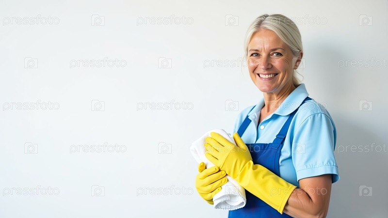 Портрет взрослой белокожей женщины в синем фартуке и желтых резиновых перчатках с тряпкой в руке возле белой стены со свободным местом для текста, услуги очистки окон, уборки дома, горничной
