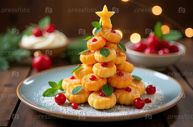 Вкусные выпечки печенье в виде рождественской елки из ягод, листьев мяты на праздничном новогодном столе. Рецепт и красивая презентация. Рождественский декор и установка стола. ИИ генерируется
