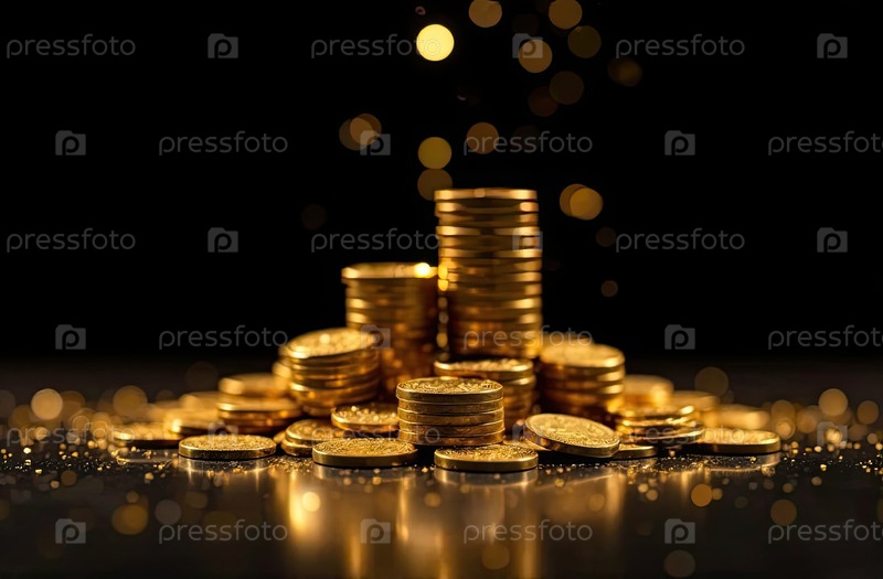 Стол золотых монет на черном фоне с блеском.Сбережения, инвестиции, капитал, бизнес.Искусственный интеллект генерирует