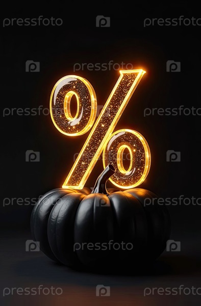 Золотой светящийся процентный знак с тыквой на черном фоне со свободным местом для текста. Осенние распродажи и скидки, баннер Harvest и Halloween, флаер с пространством для копирования. ИИ генерируется