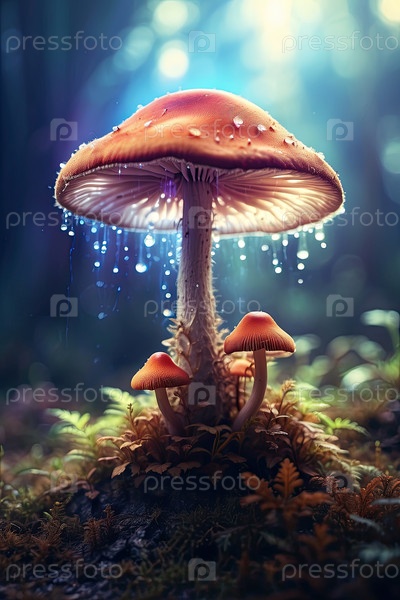 Высокий псилоцибиновый гриб, пропитанный дождем лес, галлюцинационные споры, риск наркотиков, психоактивный опыт, символ психически изменяющей зависимости