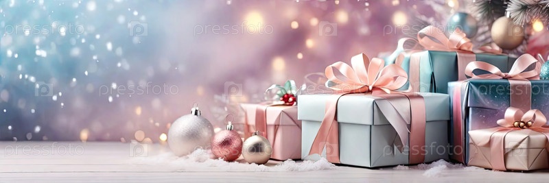 Рождественский фон с подарочными коробками с лучами в нежных розовых, бежевых, синих тонах, боке и фейри-свете. Праздничное настроение Рождество и Новый год. Поздравительная открытка, баннер. ИИ генерируется