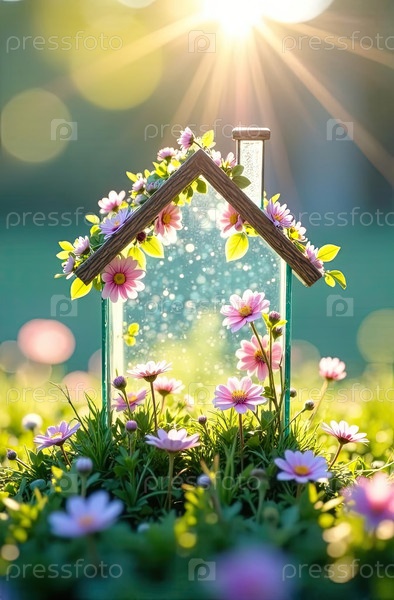 Крошечный экологический дом теплица в солнечных лучах, с весенними пастельными цветами на весеннем пастельно-синем фоне. недвижимость, риэлтор, ипотека, страхование, бронирование, строительство, изоляция. ИИ генерируется