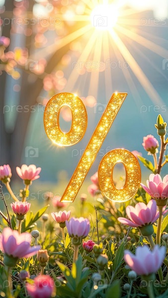 Золотой прозрачный процентный знак в солнечных лучах, украшен весенними пастельными цветами.Весенняя распродажа и скидки, 8 марта, Пасха, баннер женского дня, флаер с копировальным пространством. ИИ генерируется