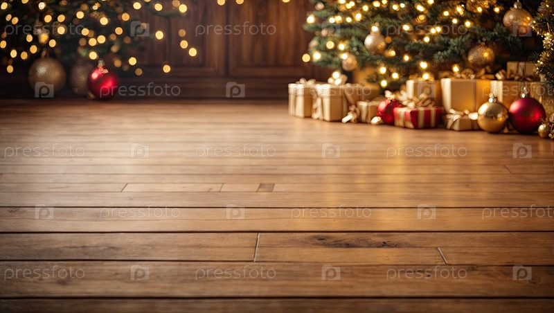 Пустой деревянный пол в коричневых и золотых тонах для отображения продукции со стеной во внутренней части комнаты, с рождественским декором. Копирование пространства, Рождество и Новый год. ИИ генерируется