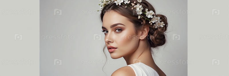 Белая женщина с беспорядочным плетенным украшением и дикими цветами, портрет весенней красавицы, естественный стиль, нежный цветок