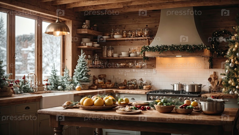 Уютная деревенская кухня с рождественским декором, новогоднее настроение, подготовка к празднику, посуда.Счастливого Рождества и счастливого Нового года поздравительную карточку, тепло дома.Искусственный интеллект генерирует