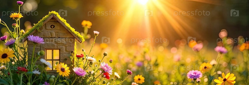 Крошечный экологический каркасный дом теплица в солнечных лучах, с летними цветами на солнечном фоне в поле. недвижимость, дача, летний дом, ипотека, страхование, бронирование, строительство, изоляция. ИИ генерируется