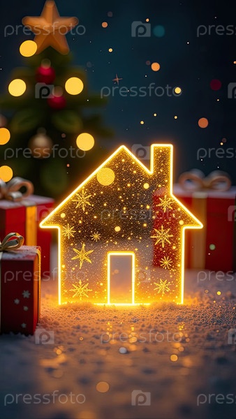 Прозрачное золото светящийся символ дома и коробка для подарков под елкой на рождественском фоне с золотым блеском