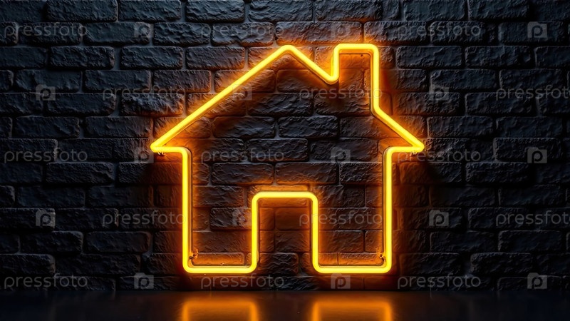 Прозрачное золото светящийся символ дома на фоне черной кирпичной стены с золотым блеском. недвижимость, риэлтор, ипотека, страхование, бронирование, строительство, изоляция, отопление. AI generated