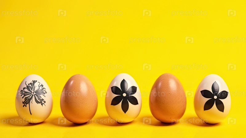 В нижней части изображения пять яиц со свободным пространством сверху для текста, творческий цветочный черный рисунок на цветах яйца, желтый фон. Пасхальный баннер с пробелом для текста. ИИ генерируется