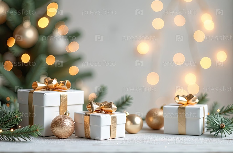Рождественский фон с белыми коробками для подарков со золотыми лучами, светящимся боке и блеском. Праздничное настроение Карта на Рождество и Новый год с копировальным пространством. ИИ генерируется