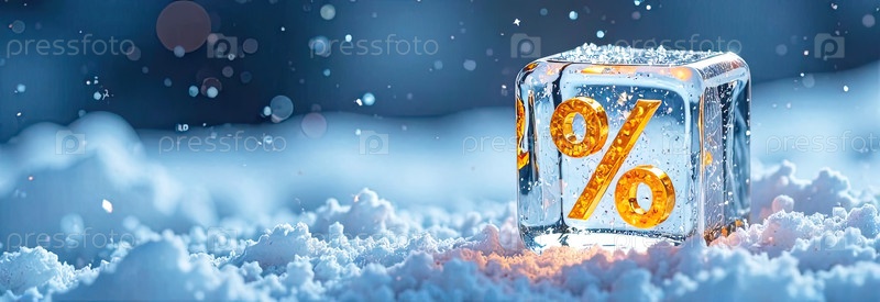 Неон светящийся золотой процентный знак в кубике льда на снежном фоне снаружи, блеск и снежинки Зимние распродажи и скидки, Черная пятница, Новый год, рождественский баннер, флаер. AI generated