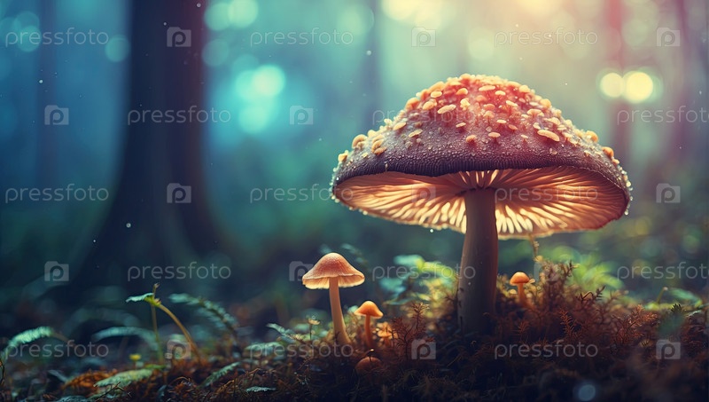 Зачарованный лес с кластером волшебных грибов, спорами псилоцибина, галлюциногенными, наркотическими экскурсиями, символизирующими психоактивную зависимость, мистической землей