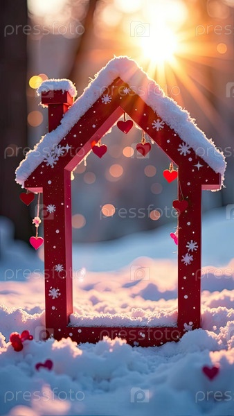 Уютный красный крошечный дом на снегу в солнечных лучах, украшенный красным сердцем и декором Валентина