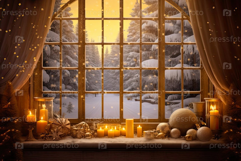 Внутреннее уютное окно с рождественским декором и теплым светом - вид изнутри зимой и снегом. отпразднуйте Рождество и Новый год, елку, боке, снег. ИИ генерируется