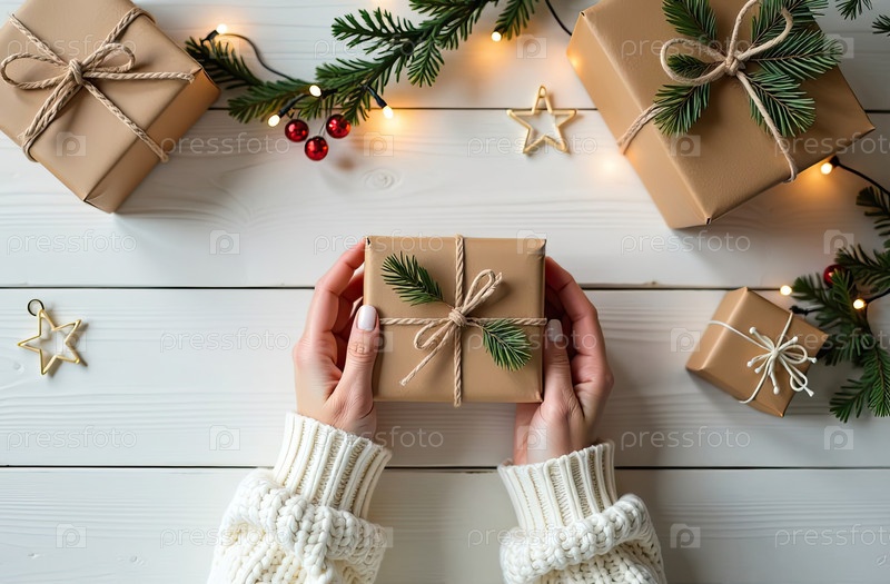 Упаковать подарок на Рождество и Новый год в крафт-бумаге, привязанный веревкой с луком с рождественским декором на белом столовом столе, натуральный декор. Праздничное настроение. Flatlay, background, copy space. AI generated