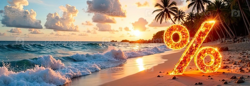 Огненный горящий знак процент на берегу моря с тропическими пальмами в свете солнца, фон заката океана. жаркая летняя распродажа и скидки, горящий тур-баннер, флаер. ИИ генерируется
