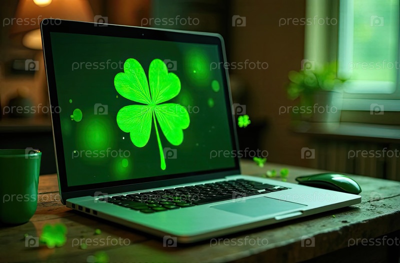 Ноутбук с зеленым клевером на экране в волшебном декоре ко Дню Святого Патрика. Сезонная дистанционная работа, интернет, рождественская карточка, шопинг, удача, зеленый дом. ИИ генерируется