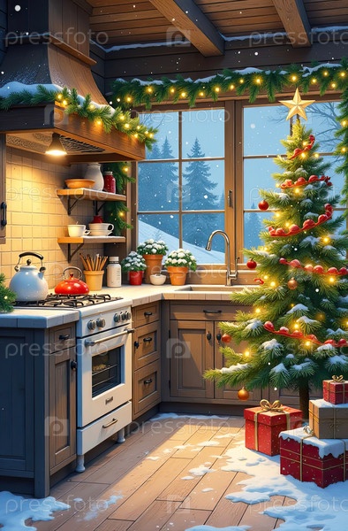 Рустический интерьер уютной рождественской кухни, новогоднее настроение, подготовка к празднику, посуда. Рождественский декор снежной кухни с приготовленным ужином. ИИ генерируется