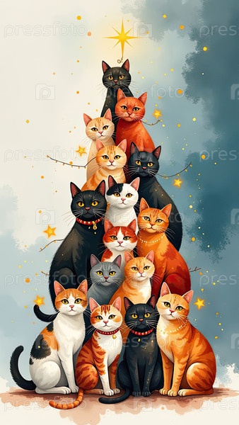 Акварельная рождественская елка из кошек, сделанная на праздничном фоне с блеском, многоцветные сотни кошек складываются в форме высокой рождественской елки с золотыми светящимися гирляндными огнями
