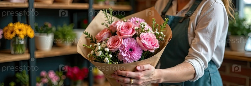 Букет роз и весенних цветов в руках флориста, упакованный в крафт-бумагу в интерьере цветочного магазина, доставка на праздник.Весна, 8 марта, женский день, день рождения. ИИ сгенерировано