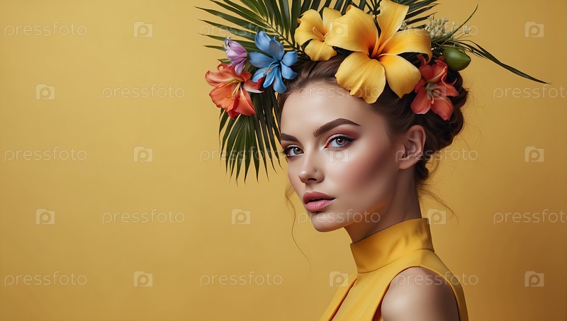 Белая женщина в боковом профиле с подсолнечником и тропическими листьями, летний портрет красавицы, тропическая грация, свежая энергия