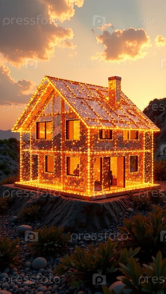 Прозрачное золото светящийся проект дома в натуральном размере на земельной площади. недвижимость, риэлтор, ипотека, страхование, здания, строительство, изоляция, отопление. ИИ генерируется
