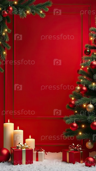 Рождественские поздравительные открытки приглашение с пространством для текста в рамке на красном фоне со светящейся елкой и гирляндой, шарами, подарочными коробками