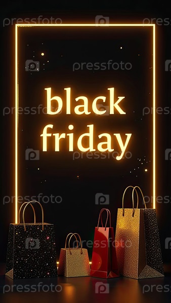 Неоновые светящиеся золотые буквы "Черная пятница" на черном фоне. витрина магазина для Черной пятницы, распродажи, скидки, сумки для покупок, созданные ИИ