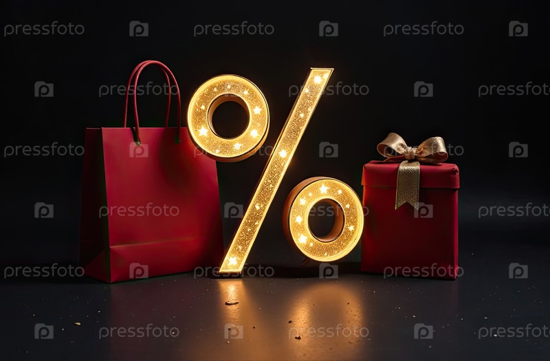 Неон светящийся золотой процентный знак на черном фоне. витрина магазина для Черной пятницы, распродажи, скидки, сумки для покупок. баннер, флаер. AI generated