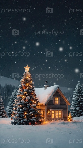 Рождественская открытка с кописпейсом на праздничном снежном фоне с рождественской елкой, уютным домом На снегу снаружи