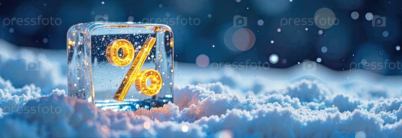 Неон светящийся золотой процентный знак в кубике льда на снежном фоне снаружи, блеск и снежинки Зимние распродажи и скидки, Черная пятница, Новый год, рождественский баннер, флаер. AI generated
