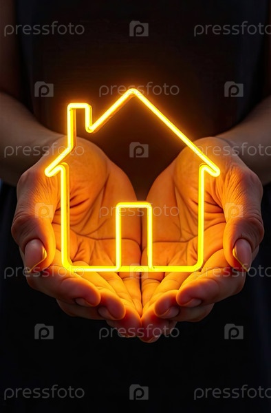 Золото светящийся символ уютного дома В ладонях рук с золотым блеском. Недвижимость, риэлтор, ипотека, страхование, бронирование, изоляция, мечта о собственном доме. ИИ генерируется