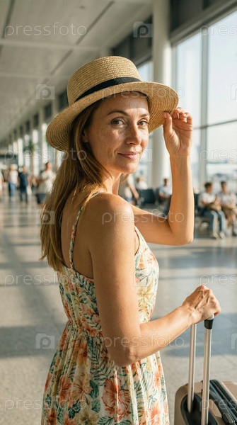 Женщина в летней шляпе, оглядываясь назад и улыбаясь на терминале аэропорта, путешественное удовольствие, приключение отпуска, ожидание поездки, стиль жизни аэропорта