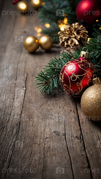 Рождественская открытка с кописпейсом на уютном деревянном столе с елкой, рождественскими шарами, свечами, конусами и блестками