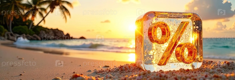 Неон светящийся золотой процентный знак в кубике льда на берегу моря с тропическими пальмами при солнечном свете, туристический фон. Горячая летняя распродажа и скидки, горячий баннер тура, флаер. ИИ генерируется
