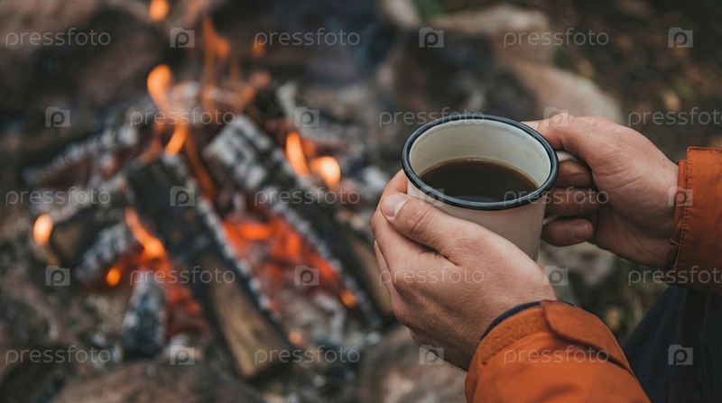 Руки, держащие металлическую чашку горячего напитка за костром, кемпинг на открытом воздухе, уютный момент, отдых в дикой природе, перерыв во время путешествия, тепло