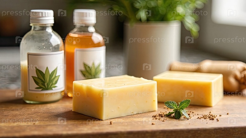 Ручно сделанный натуральный эко-сапун на деревянном столе с бутылками с ароматизатором, красителем и мыльной основой. Подарок, подарок, ремесленная домашняя гигиена. Хоби изготовление мыла, дома сделано. ИИ генерируется;