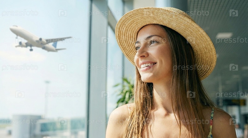 Женщина с шляпой улыбается и смотрит в окно аэропорта на самолет, мечты о путешествии, ожидание, отпускное путешествие, праздничное счастье