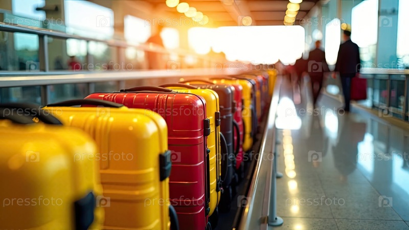 Куча желтых и красных чемоданов в аэропорту - контроль грузов, допускаемый багаж и параметры ручной клади на самолете, охрана, регистрация и доставка личных вещей
