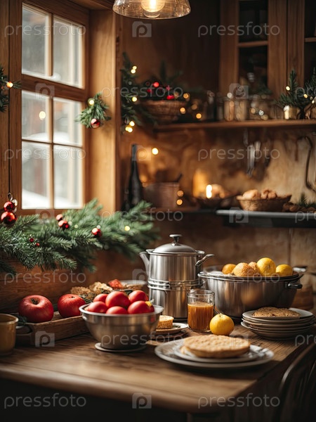 Уютная деревенская кухня с рождественским декором, новогоднее настроение, подготовка к празднику, посуда.Счастливого Рождества и счастливого Нового года поздравительную карточку, тепло дома.Искусственный интеллект генерирует