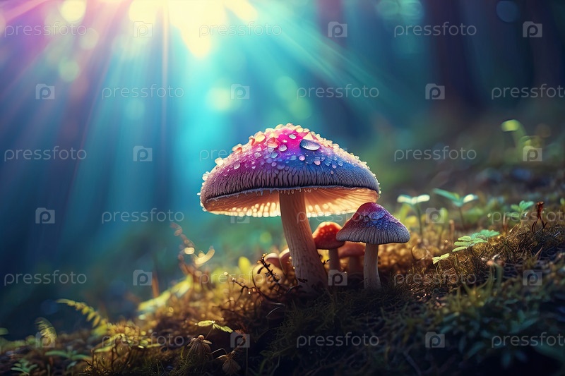 Лучи солнца на волшебном грибе, психоделическая атмосфера, споры псилоцибина, психоактивная поездка, символ психически изменяющей зависимости и риска