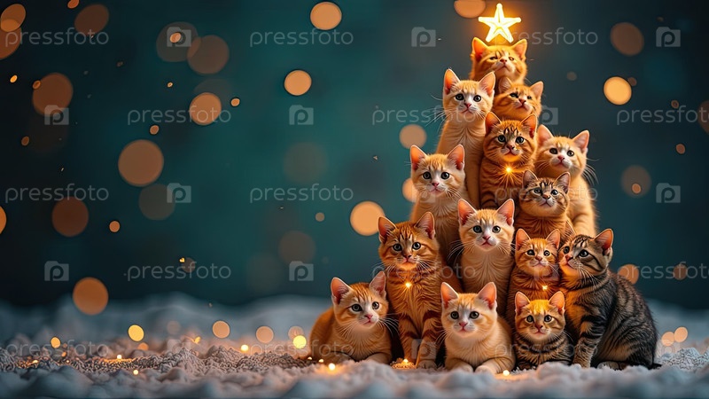 Рождественская елка из кошек, сделанная на праздничном снежном фоне с блеском, многоцветные сотни кошек складываются в форме высокой рождественской елки с золотыми светящимися гирляндными огнями