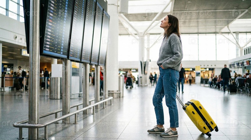 Женщина с чемоданом стоит рядом с информационной доской о полете в терминале аэропорта, планирование путешествия, ожидание, подготовка к поездке, городское приключение