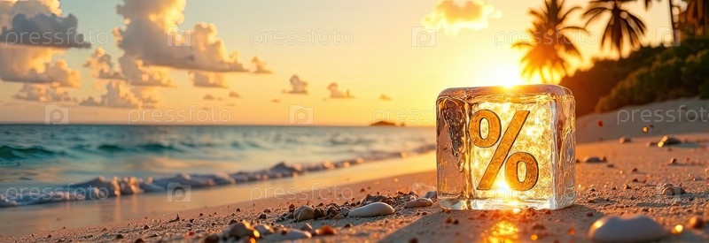Неон светящийся золотой процентный знак в кубике льда на берегу моря с тропическими пальмами при солнечном свете, туристический фон. Горячая летняя распродажа и скидки, горячий баннер тура, флаер. ИИ генерируется