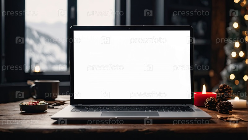 Ноутбук с белым экраном макет на столе в офисе рождественского декора с огнями боке, свечами, сверхурочной работой по праздникам, домашний офис, черная пятница,