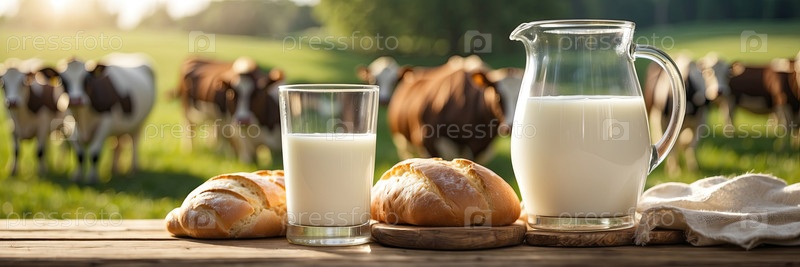Свежее деревенское коровье молоко в кружке и белый ароматный хлеб и выпечка на столе на фоне луга, где пасутся коровы