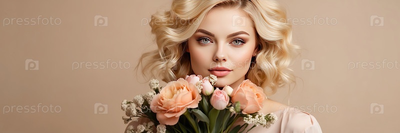 Блондинка с мягкими локонами и бежевыми цветами, портрет весенней красоты, нежная элегантность, женственность, флористика, 8 марта, празднование женского дня